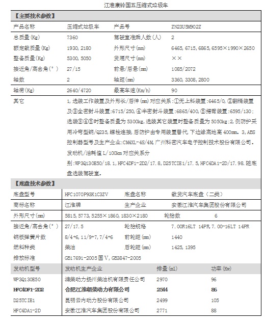 下面是江淮康鈴壓縮式垃圾車的主要技術參數: