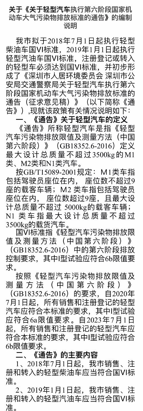 特別值得關注的是,《征求意見稿》提到:“本通告所稱國Ⅵ標準指《輕型汽車污染物排放限值及測量方法(中國第六階段)》(GB18352.6-2016)中的第六階段排放控制要求,其中Ⅰ型試驗應符合6b限值要求。”這意味著深圳將跳過國六a直接實施輕型車國六b標準。