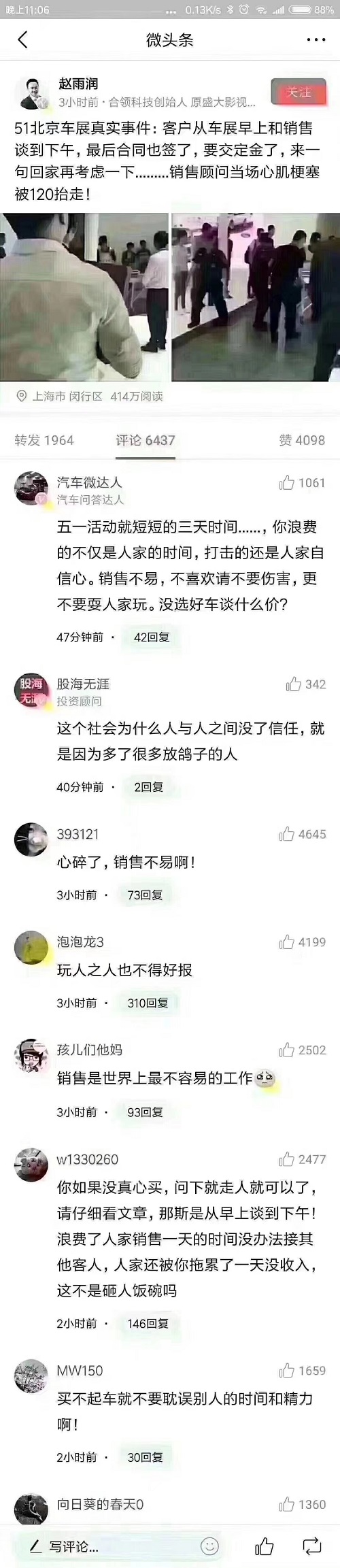 不少自稱汽車銷售人員的網(wǎng)友在微博評(píng)論下留下怨言,聲稱賣車不容易,賣車賣到懷疑人生。