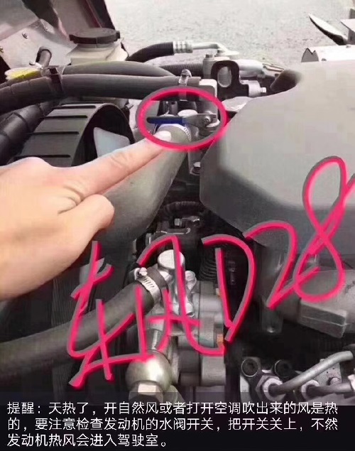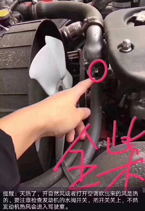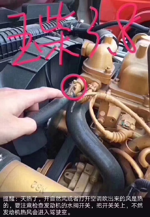 其他品牌發(fā)動(dòng)機(jī)上一般也會(huì)有類似的閥門,各位可以檢查一下,夏天的時(shí)候關(guān)閉(手柄和管路垂直)可以防止熱風(fēng)循環(huán)到駕駛室內(nèi),冬天的時(shí)候一定要開啟(手柄和管路平行),這樣駕駛室內(nèi)才能有暖風(fēng)。