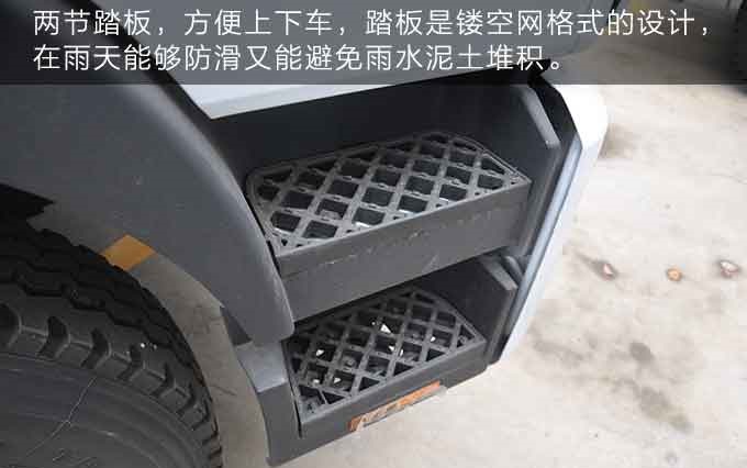 首先,進(jìn)入視線的是東風(fēng)多利卡D9吸污車駕駛室的兩節(jié)踏板,因?yàn)檫@款吸污車的底盤(pán)比較高,為了方便上下車,所以設(shè)計(jì)了兩節(jié)踏板,且踏板是鏤空網(wǎng)格式的設(shè)計(jì),在雨天能夠防滑又能避免雨水泥土堆積。
