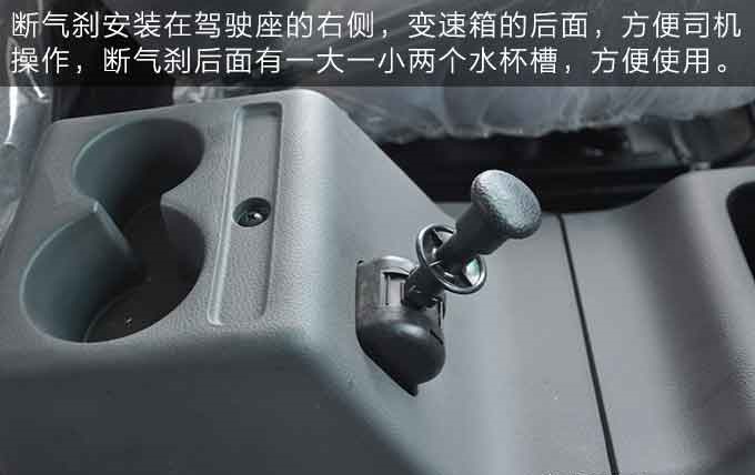 斷氣剎安裝在駕駛座的右側(cè),變速箱的后面,方便司機(jī)操作,斷氣剎后面有一大一小兩個(gè)水杯槽,方便使用。