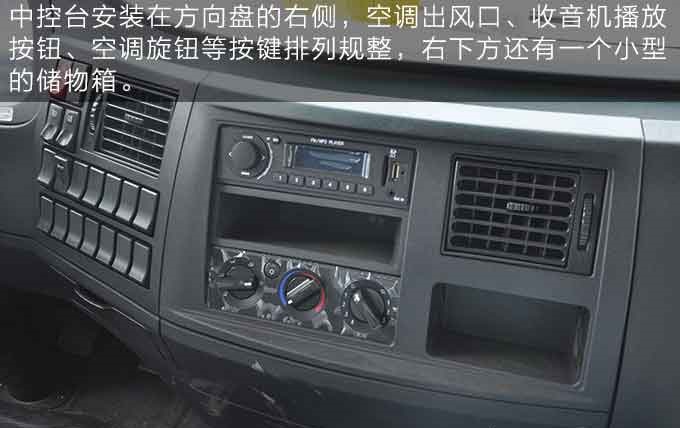 中控臺(tái)安裝在方向盤(pán)的右側(cè),空調(diào)出風(fēng)口、收音機(jī)播放按鈕、空調(diào)旋鈕等按鍵排列規(guī)整,右下方還有一個(gè)小型的儲(chǔ)物箱。