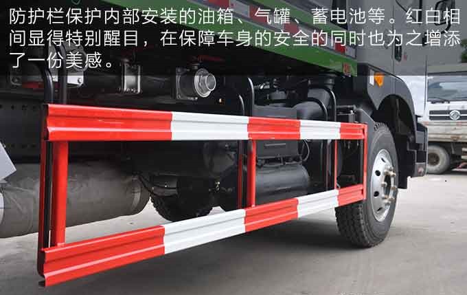 防護(hù)欄保護(hù)內(nèi)部安裝的油箱、氣罐、蓄電池等。紅白相間顯得特別醒目,在保障車身的安全的同時(shí)也為之增添了一份美感。從整體上看,東風(fēng)多利卡D9吸污車底盤裝置還是很齊全的,安全性能很好,東風(fēng)的品牌、質(zhì)量、性能都是值得肯定的。
