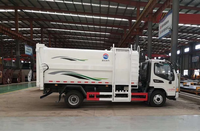 側(cè)裝壓縮式垃圾車是在掛桶式垃圾車(自裝卸式垃圾車)的基礎(chǔ)上發(fā)展起來的,主要是在自裝卸式垃圾車的基礎(chǔ)上加裝液壓推鏟,來實(shí)現(xiàn)壓縮功能。在掛桶式垃圾車的基礎(chǔ)上結(jié)合對接式垃圾車的液壓鎖緊后門,搭配增加的推鏟,達(dá)到壓縮的效果。