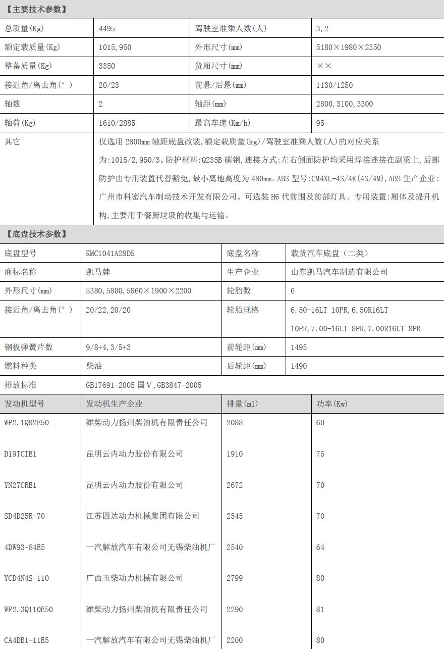 詳細(xì)的凱馬餐廚垃圾車的參數(shù)表如下: