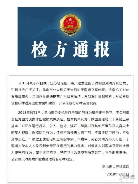 昆山市人民檢察院和昆山市公安局對昆山反殺案發(fā)布通報