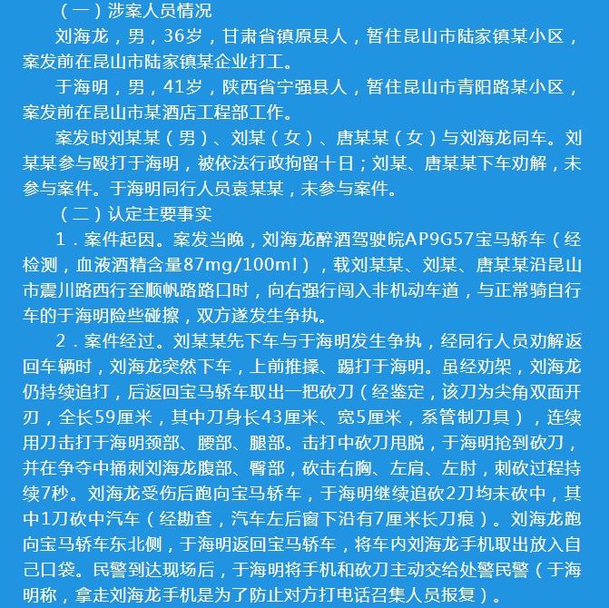 1。案件起因。案發(fā)當晚,劉海龍醉酒駕駛皖AP9G57寶馬轎車(經(jīng)檢測,血液酒精含量87mg/100ml),載劉某某、劉某、唐某某沿昆山市震川路西行至順帆路路口時,向右強行闖入非機動車道,與正常騎自行車的于海明險些碰擦,雙方遂發(fā)生爭執(zhí)。