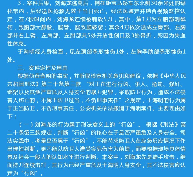 3。案件后果。劉海龍?zhí)与x后,倒在距寶馬轎車東北側(cè)30余米處的綠化帶內(nèi),后經(jīng)送醫(yī)搶救無效于當日死亡。經(jīng)法醫(yī)鑒定并結(jié)合視頻監(jiān)控認定,在7秒時間內(nèi),劉海龍連續(xù)被刺砍5刀,其中,第1刀為左腹部刺戳傷,致腹部大靜脈、腸管、腸系膜破裂;其余4刀依次造成左臀部、右胸部并右上臂、左肩部、左肘部共5處開放性創(chuàng)口及3處骨折,死因為失血性休克。