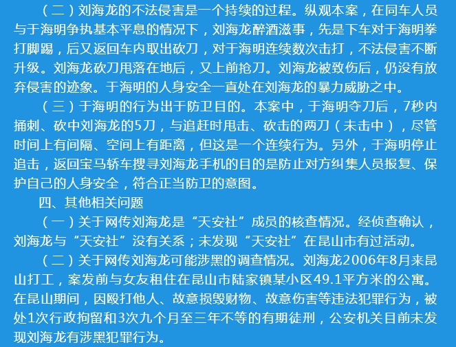 (一)關(guān)于網(wǎng)傳劉海龍是“天安社”成員的核查情況。經(jīng)偵查確認,劉海龍與“天安社”沒有關(guān)系;未發(fā)現(xiàn)“天安社”在昆山市有過活動。