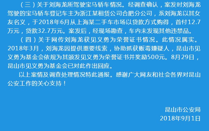 ?。ㄋ模╆P(guān)于網(wǎng)傳劉海龍獲見義勇為榮譽證書情況。此情況屬實。2018年3月,劉海龍因提供重要線索,協(xié)助抓獲販毒嫌疑人,昆山市見義勇為基金會依規(guī)為其頒發(fā)見義勇為榮譽證書并獎勵500元。8月29日,昆山市見義勇為基金會已對此作出回應。