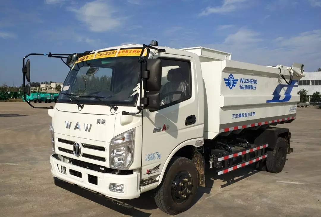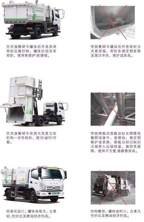 無泄漏餐廚垃圾車是垃圾車廠家根據(jù)國內(nèi)餐廚垃圾收集處理現(xiàn)狀,在吸收國內(nèi)外同類產(chǎn)品優(yōu)點(diǎn)的基礎(chǔ)上,自主創(chuàng)新研發(fā)的真正做到無泄漏的餐廚垃圾運(yùn)輸車。該車投料口與卸料口均位于垃圾箱頂部并且加裝密封蓋進(jìn)行徹底密封,徹底杜絕了餐廚垃圾收集過程中泔水滴漏造成的二次污染。箱體采用不銹鋼材質(zhì)、自重輕、容積大,有效載質(zhì)量可達(dá)5噸。該車采用專利舉升卸料機(jī)構(gòu)進(jìn)行垃圾傾卸,可舉升近90°,垃圾傾卸徹底,方便、快捷。