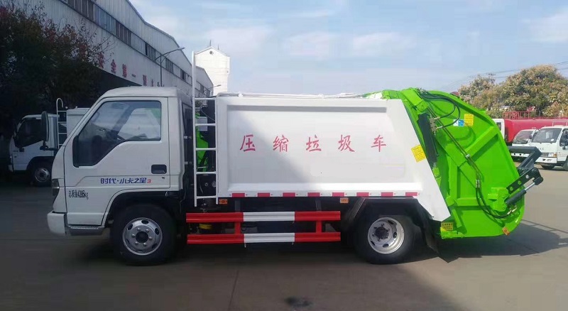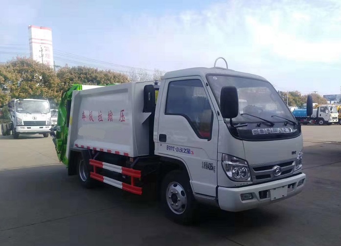 福田時代小卡之星藍牌壓縮式垃圾車選裝配置:尾部進料翻轉架或翻轉斗,PLC一鍵操控系統(tǒng)。