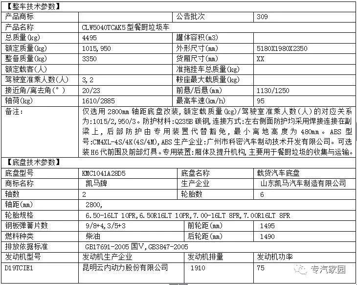 凱馬3方餐廚垃圾車整車尺寸5180×1980×2350 ,容積:2.5~3m3,總質量:4495Kg,額定質量:1015,950kg,整備質量:3350kg,軸距:2800,輪胎規(guī)格:6.50R16