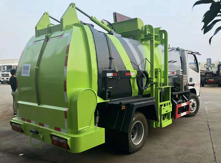 其工作原理是:將盛有餐廚垃圾、容積為120L(或240L)的標(biāo)準(zhǔn)垃圾桶掛好在側(cè)提桶機(jī)構(gòu)桶架上后,啟動提升機(jī)開關(guān),此時,頂蓋板打開、桶鎖緊并提升,當(dāng)桶提升到最高位置后,擺臂將桶翻轉(zhuǎn)將餐廚垃圾倒入垃圾箱中,然后空桶翻轉(zhuǎn)回位后下降直至機(jī)構(gòu)松開空桶并回到起始位置關(guān)閉頂蓋板,該投料過程自動控制,能一次或多次地進(jìn)行。當(dāng)投料作業(yè)完成或作業(yè)過程中需壓縮垃圾箱內(nèi)餐廚垃圾時,采用手動方式操縱推板來壓縮垃圾并保持在壓實位置上,實現(xiàn)垃圾箱內(nèi)餐廚垃圾油水的初步分離和垃圾減容。此餐廚垃圾車采用推鏟推擠排料,其過程為自動控制。推擠排料過程為后門鎖銷打開,并通過順序閥打開后門,后門完全開啟后,啟動推板向后移動推料,沿水平方向?qū)⒗淅锏睦瞥?,然后推板退回到位、后門關(guān)閉到位后啟動鎖銷鎖緊。