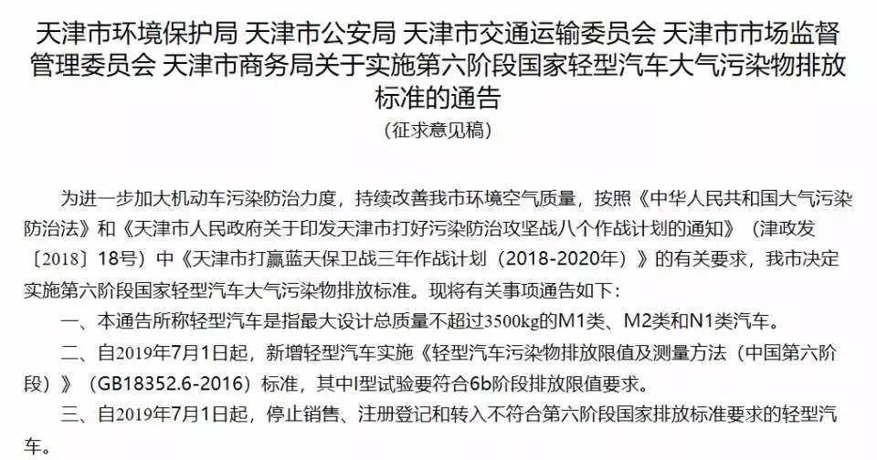 天津:11月28日,天津市環(huán)保局、公安局等多部委聯(lián)合發(fā)布了有關“國六”政策的《征求意見稿》,意見指出:“國六”排放標準計劃自2019年7月1日起實施,但該通告目前仍處于意見征集階段,這意味著天津?qū)嵤皣辈粫缬?019年7月1日。