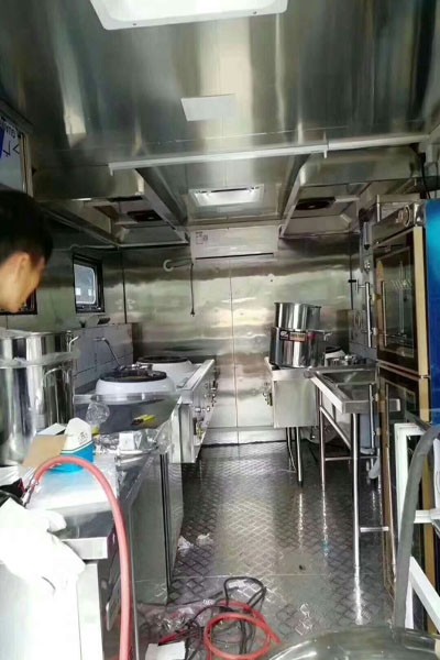 車內(nèi)采光通風(fēng)車廂配有門,五道窗(其中有四道活動(dòng)窗),一套吸油煙機(jī)。車停放時(shí),可將全部門窗打開通風(fēng)。車在行進(jìn)中,可將抽排油煙機(jī)打開排氣,另外,頂換氣扇即可進(jìn)氣又可排氣;車側(cè)面四道窗都為鋼化玻璃窗,可滿足白天的自然采光。另外車內(nèi)頂有兩盞頂燈,抽排油煙機(jī)上有照明燈,可滿足車內(nèi)操作照明。