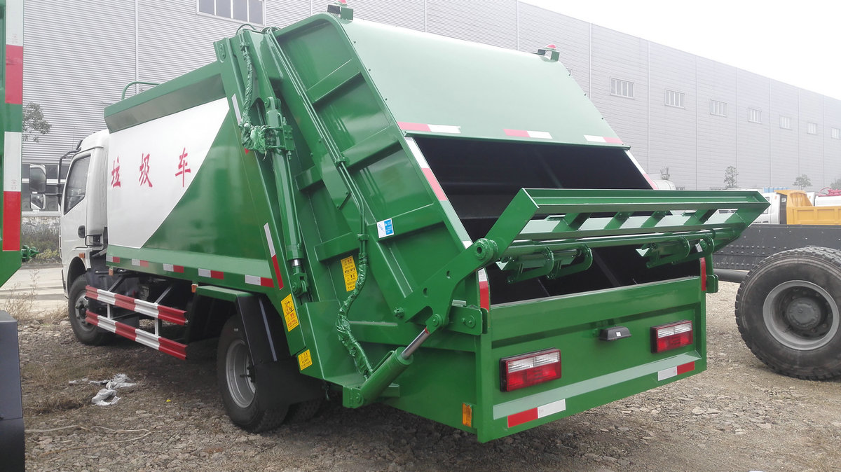 壓縮式垃圾車由汽車底盤、垃圾箱、推板、填裝器、液壓系統(tǒng)等組成,垃圾箱采用5MM厚優(yōu)質(zhì)碳鋼板制成,通過填裝器和推鏟等裝置將垃圾倒入、壓碎、壓扁,并將垃圾擠入車廂并壓實和推卸,污水全部進入填裝器底部污水廂,避免輛垃圾運輸過程中的二次污染。用戶可根據(jù)需求自行選擇裝配后掛桶翻轉(zhuǎn)機構(gòu)或垃圾斗翻轉(zhuǎn)機構(gòu)兩種翻轉(zhuǎn)機構(gòu)。該車具有自動反復(fù)壓縮以及蠕動壓縮功能,壓縮比高、密封性好、裝載量大﹑操作方便、環(huán)保性好﹑整車?yán)霉β矢叩葍?yōu)點,廣泛用于市政環(huán)衛(wèi)、大型廠礦、小區(qū)內(nèi)運輸各種垃圾。
