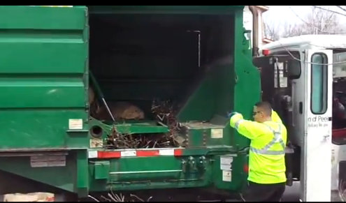 從視頻中可以看出,垃圾車的掛桶已經(jīng)變成了垃圾槽,并且被分成了兩部分,一部分裝載可回收垃圾,另一部分裝載不可回收垃圾。同樣通過舉升裝置,將兩部分的垃圾分別倒入同一垃圾車的不同區(qū)域。