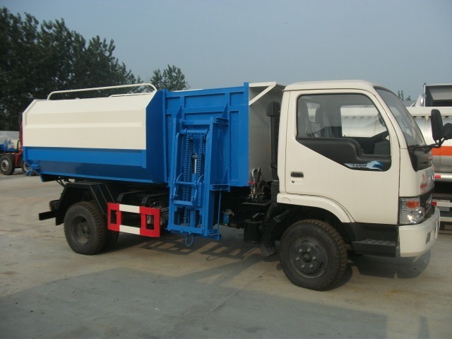 做掛桶式自裝卸垃圾車時垃圾斗容積為5立方米。垃圾箱頂部封閉,頂部前端開口裝上掛桶提升機構(gòu)。這次根據(jù)客戶要求,采用液壓式自動提升翻轉(zhuǎn)機構(gòu),所有操作集成在駕駛室一次完成,不用下車操作。進一步簡化了操作流程。以下是此款車做成常規(guī)掛桶式自裝卸垃圾車時的照片: