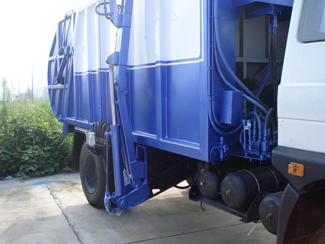 垃圾箱為自卸式設(shè)計。箱底同樣由自卸油缸控制。裝運完畢后將垃圾拉到垃圾場,倒車到指定位置后,在駕駛室啟動垃圾箱自卸裝置,箱底油缸開始舉升,垃圾箱整體被撐起,后蓋自動打開,垃圾可實現(xiàn)微殘留的完整自卸。