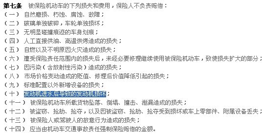 除發(fā)動機損壞外,商業(yè)車損險均可賠償。其中責(zé)任免除條款如下: