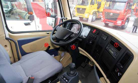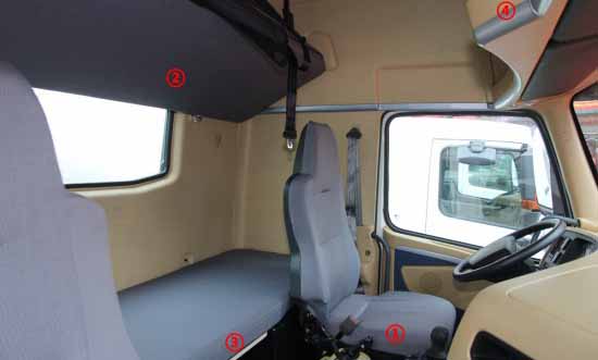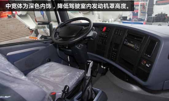 中寬體駕駛室采用了深顏色內(nèi)飾,降低駕駛室內(nèi)發(fā)動機罩高度后,也就不再是平地板駕駛室了,內(nèi)部空間相對減小,駕駛室高度也有降低,不過這么做最直接的作用就是自重相比寬體駕駛室減重150kg。