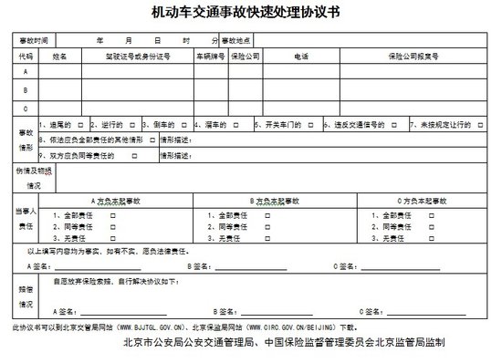 無(wú)責(zé)方無(wú)損失或損失輕微,不要求賠償,也應(yīng)向其保險(xiǎn)公司報(bào)案,并填寫《機(jī)動(dòng)車交通事故快速處理協(xié)議書》。